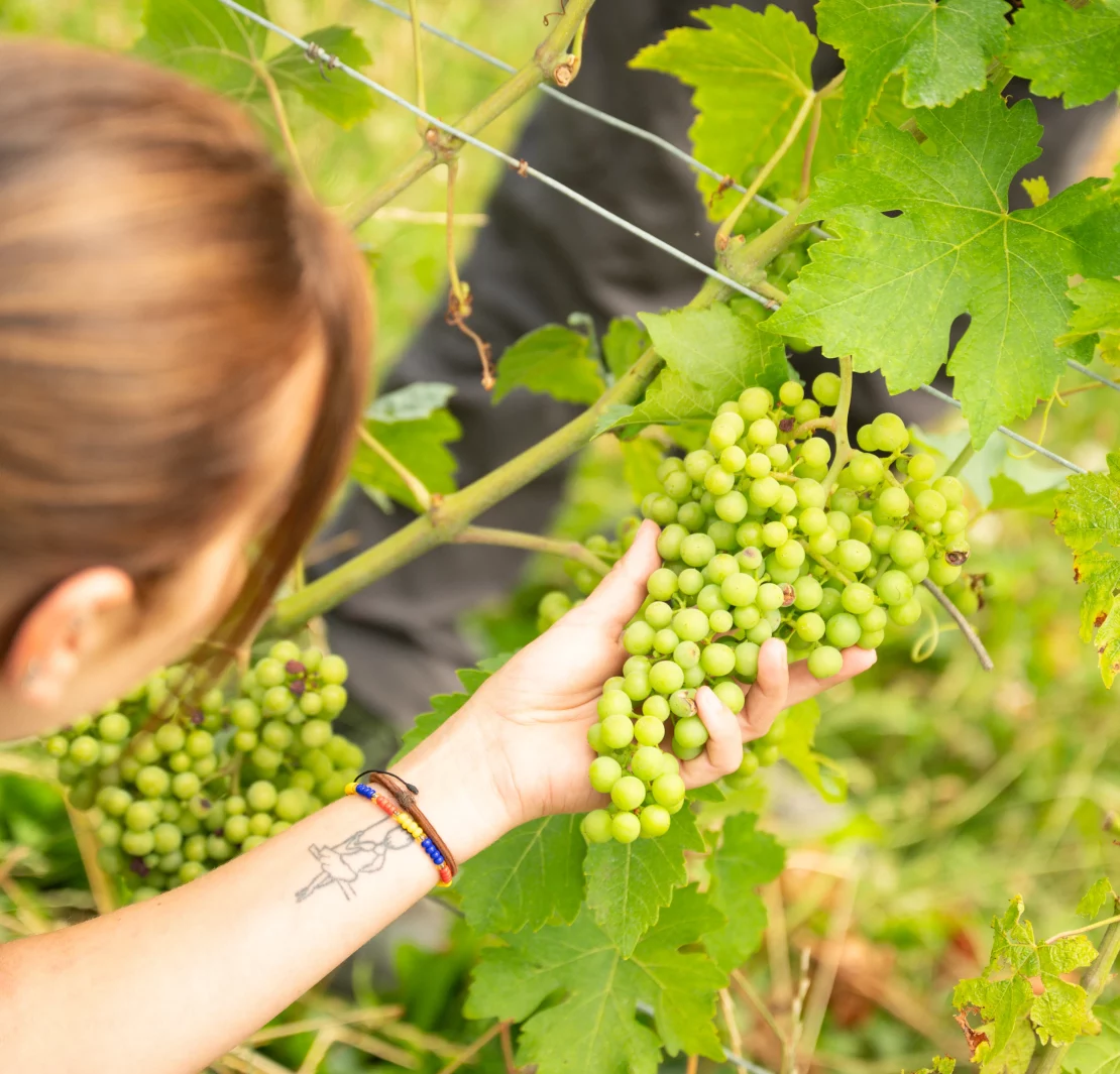 Catherine nous parle de la tête du bourgeon qui n’est jamais coupée. Ce procédé entraîne une réduction de la vigueur de la plante et permet de retarder la récolte. En effet, la concentration de sucre se développe de manière plus graduelle et offre au raisin une saveur différente. Visuellement, les vignes cultivées en biodynamie sont reconnaissables par les feuilles qui se déploient moins en abondance. Les grappes, sont alors d’avantage en contact avec les rayons du soleil.