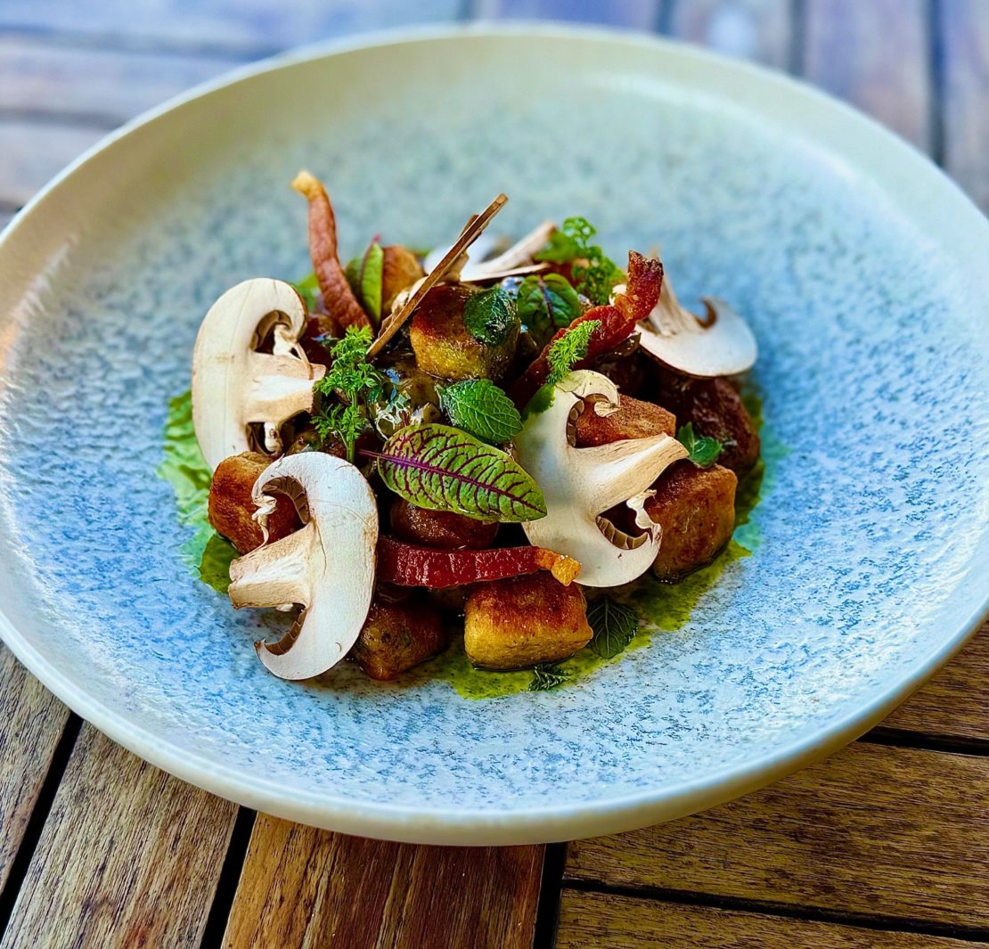 Poêler les gnocchis dans une poêle chaude avec un filet d’huile neutre (tournesol ou colza) et les colorer des deux côtés. Mettre 2/3 de gnocchis dans la sauce aux champignons et mélanger délicatement. Mettre les gnocchis sur le fond de l’assiette et garnir avec les restants de gnocchis poêlés.