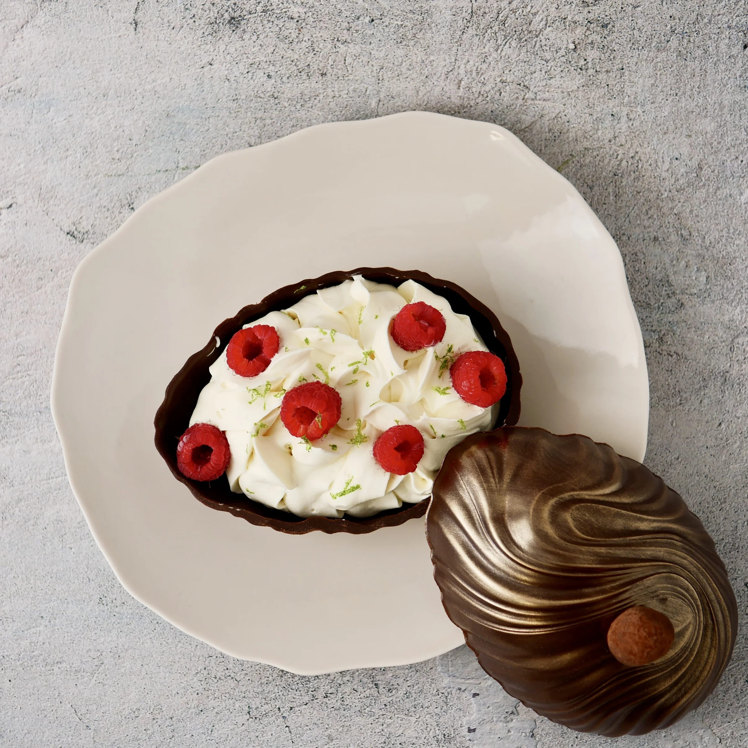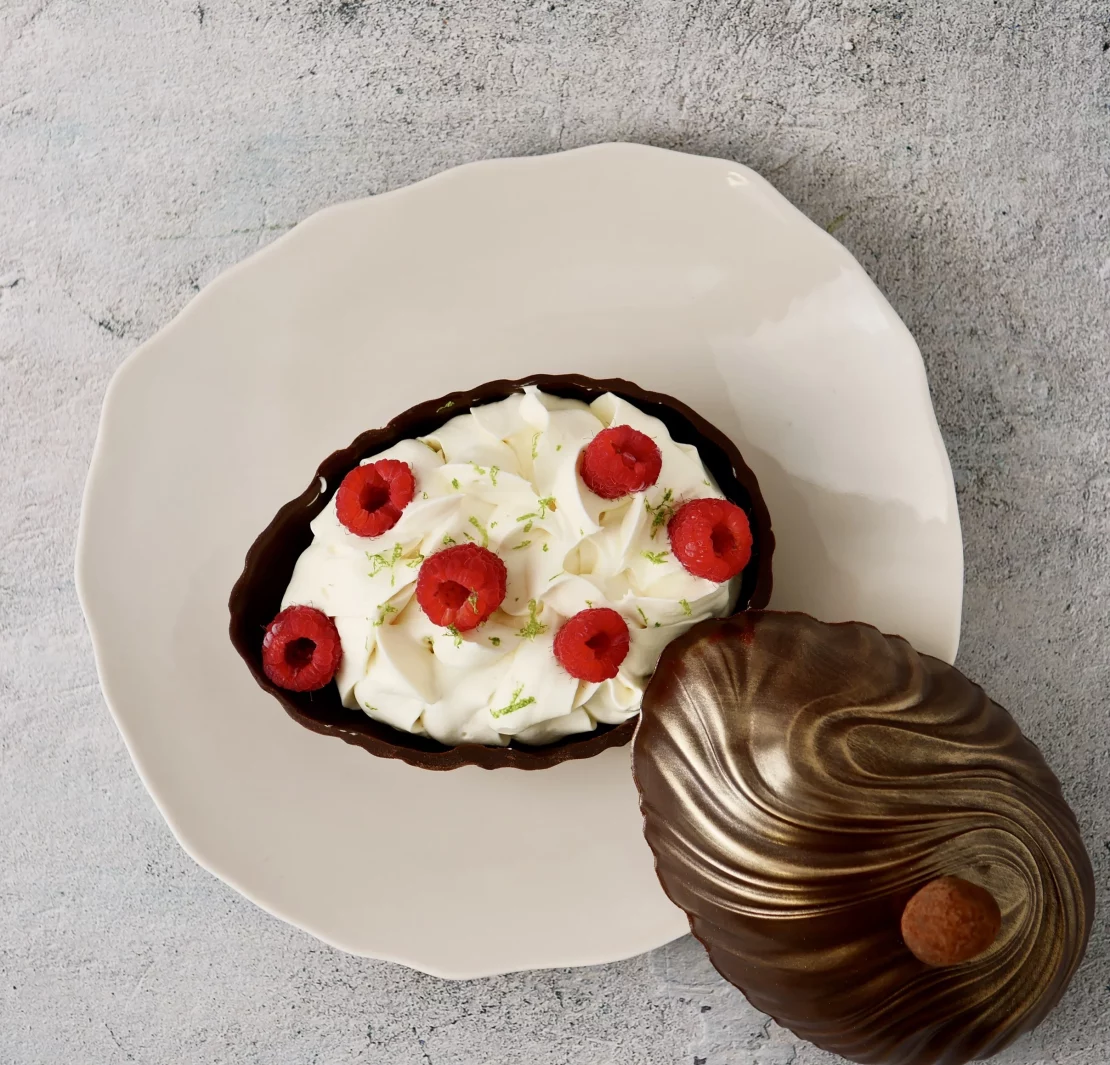 Chez Christophe Renou, l’idée du trésor caché prend la forme d’un œuf en chocolat noir Caraïbe 63 %, qui s’ouvre sur un fond croustillant, un biscuit moelleux, un confit de framboise, une mousse légère au yuzu et des framboises fraîches. Une construction raffinée, pensée autour de l’équilibre entre fruit, acidité et gourmandise.