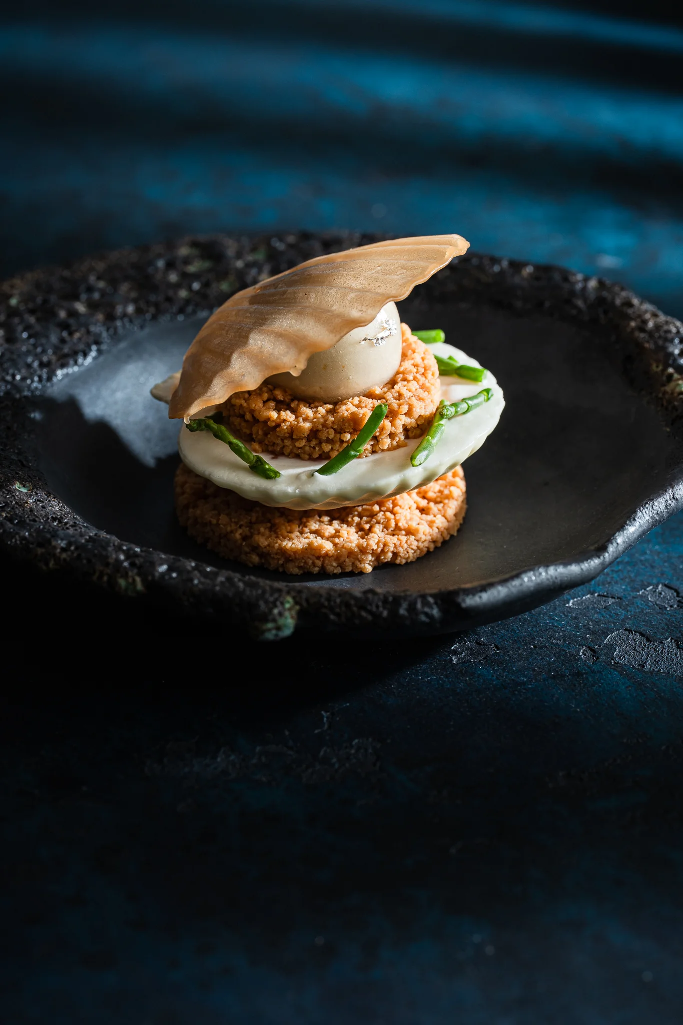 Au Four Seasons Hôtel des Bergues Genève, Lyece Major choisit une voie plus marine et lumineuse avec un dessert inspiré d’un coquillage. Une perle de kumquat acidulée y est enveloppée dans une mousse citronnée fraîche, complétée par un confit d’agrumes à la salicorne et des crumbles aux zestes. Sur le papier, l’ensemble promet une dégustation subtile, vive, presque iodée par touches.