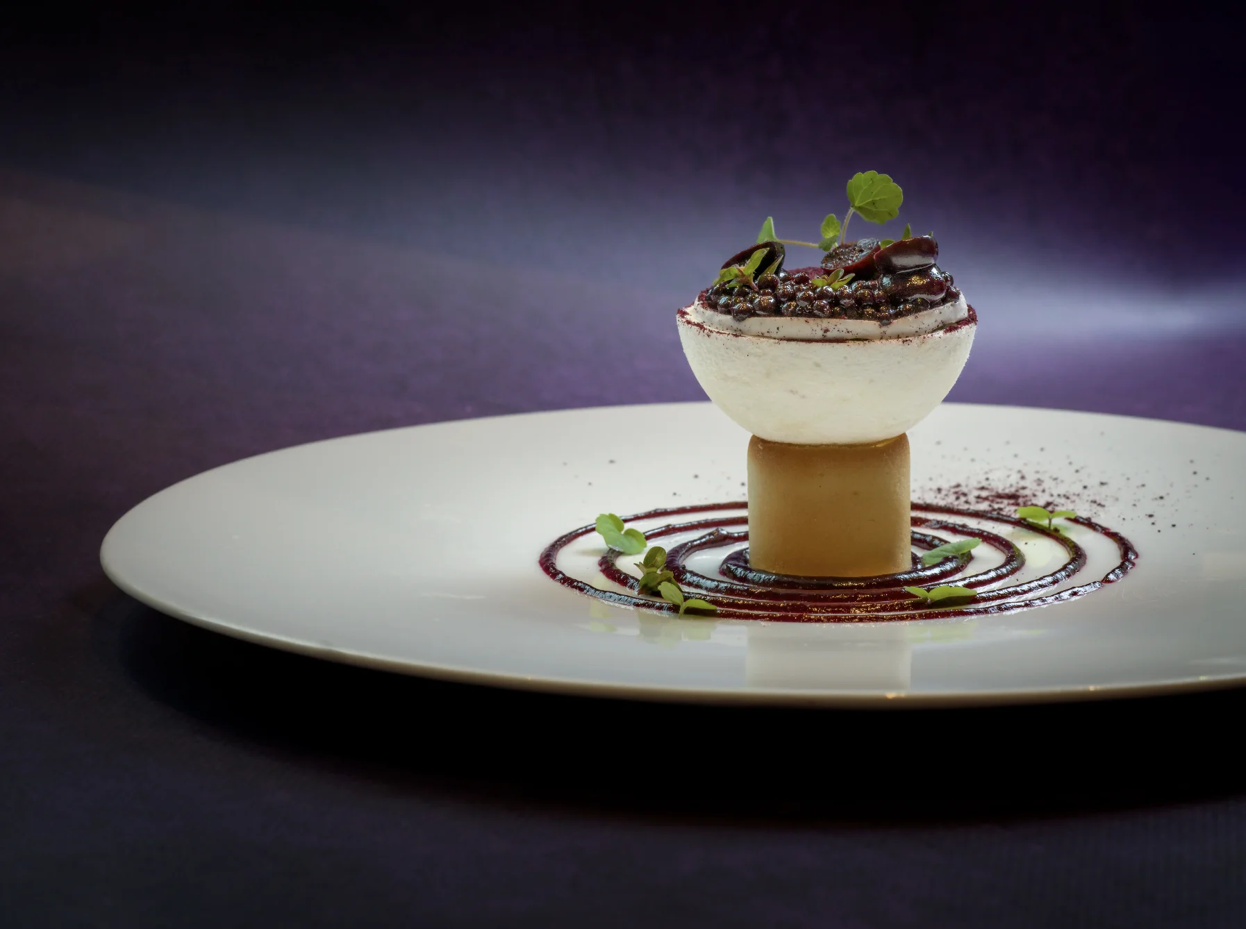 À l’Hôtel Bristol Genève, Alexis Calcagno signe « Inspiration alpine, Génépi & Myrtilles », une proposition qui regarde du côté de la montagne. Meringue à la française, mousse infusée au génépi et caviar de myrtilles composent un dessert qui évoque la Haute-Savoie et joue la carte d’une fraîcheur plus herbacée et fruitée.